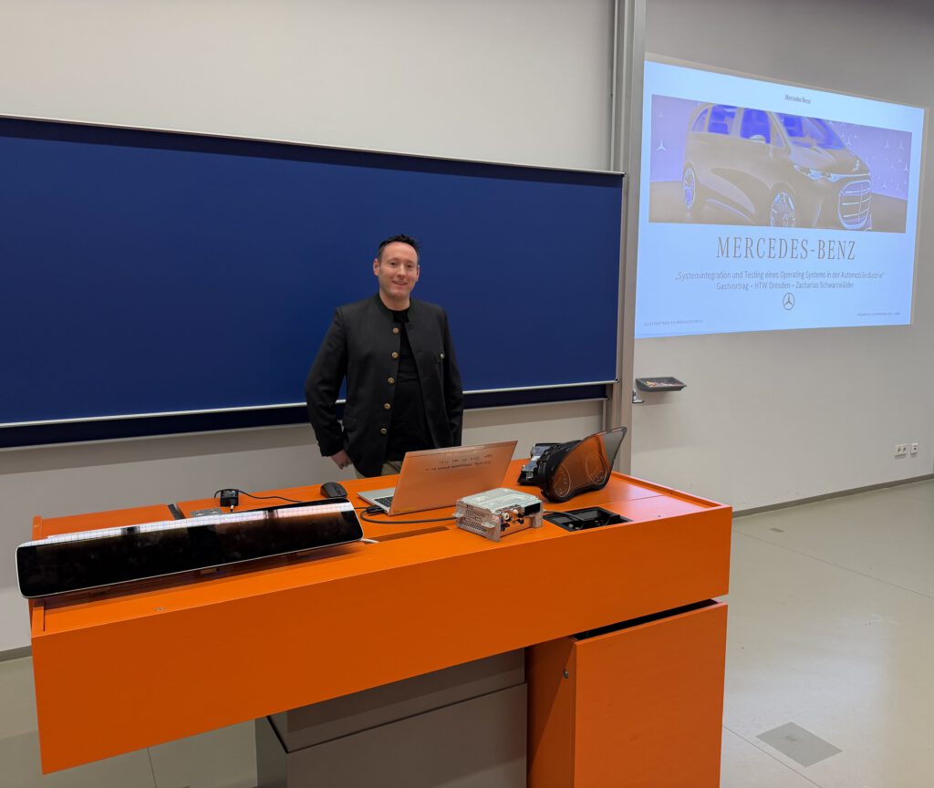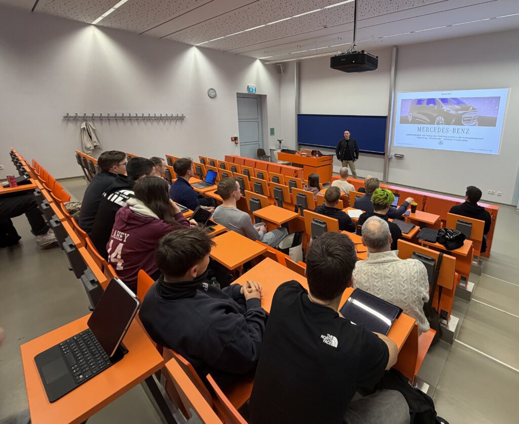 Today, Zacharias Schwarzwälder, a 2012 Mechlab graduate, visited the school from Mercedes-Benz to give a guest lecture. The students learned many details about the release of complex vehicle software. The reports on test drives were particularly fascinating. Even today, a hastily arranged trip from Stuttgart to the North Cape in an electric vehicle prototype still retains a sense of adventure. The test vehicle he brought along sparked further engaging discussions. The Mechlab team is hoping for a continuation of the guest lecture series to establish a long-term partnership.