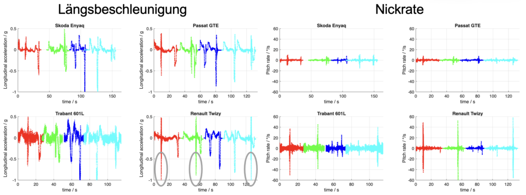 Ein erster Vergleich für 4 Fahrzeuge zeigt die deutlichen Unterschiede im Fahrverhalten. Bemerkenswert ist, dass beim Renault Twizy bei der Schwellenüberfahrt eine Verzögerung auftritt, die einer Vollbremsung entspricht (markierte Bereiche). Auch die Nickrate gibt Aufschluss über das Fahrverhalten. Auch hier zeigt der Renault Twizy wenig „Dämpfung“, dicht gefolgt vom Trabant 601L.